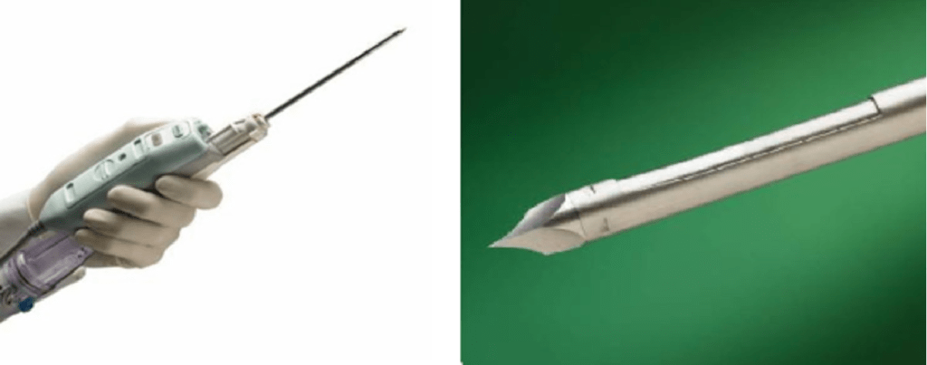 The needle is a vacuum assisted rotating needle. Here it is. It reminded me of an x-acto blade.